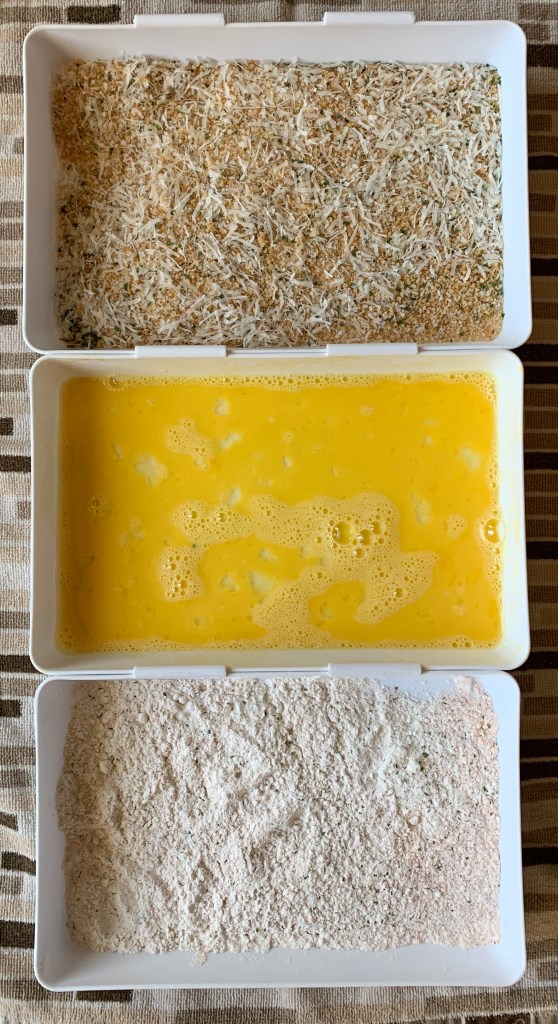 - In the 3rd bowl combine breadcrumbs, dried parsley and parmesan (if using).