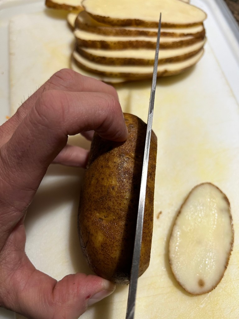 - Slice potatoes lengthwise 1/8 inch thick – trying to make as even thickness as possible. This will ensure even cooking. I typcially disgard and compost the first and last slices (skin one side) as they typically don’t cook the same as the rest.