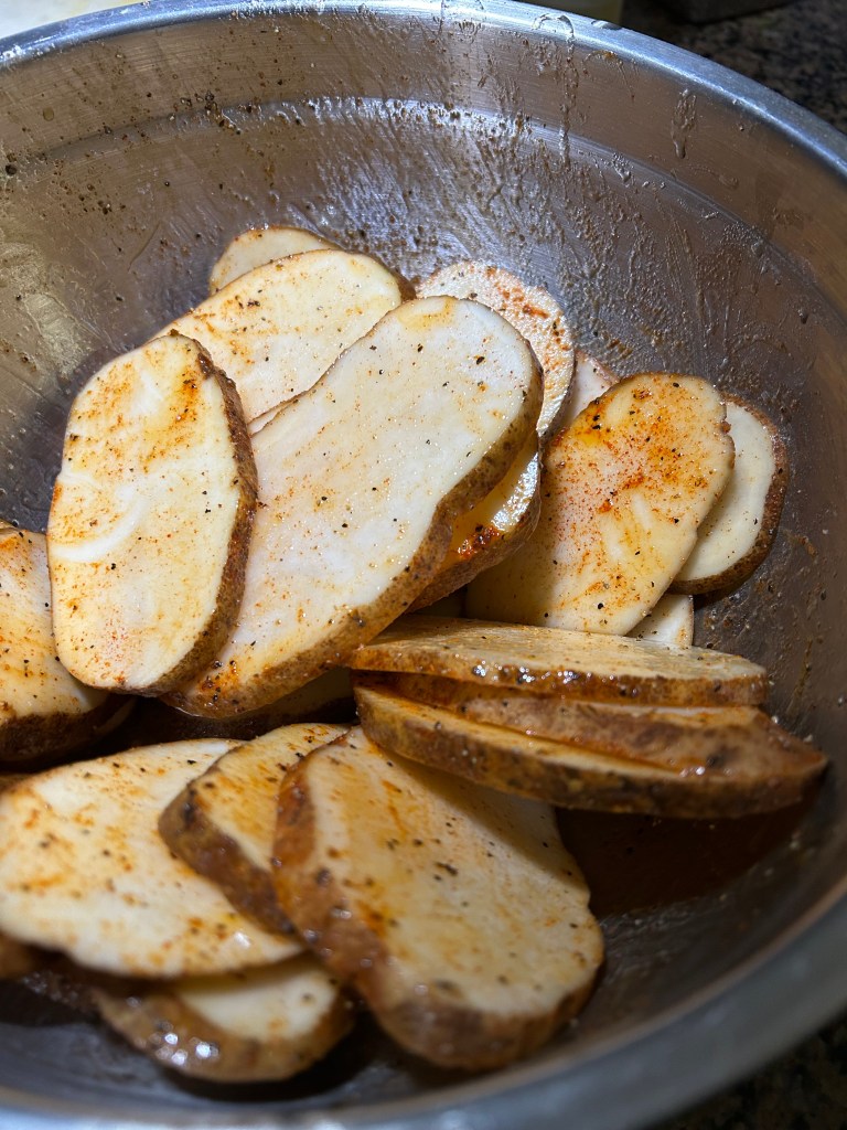 - Sprinle seasoning over potato slices – working a bit at a time, tossing slices in the bowl so that all sides of all slices are evenly coated.