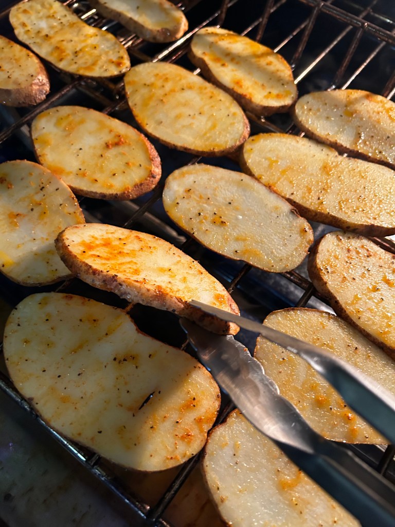 - Carefully place slices on the middle rack of your oven. Do so by sliding it out so that you can arrange slices in a single layer across the whole rack. See picture below. Be careful as rack will be very hot. Slide rack back in to oven and cook potatoes