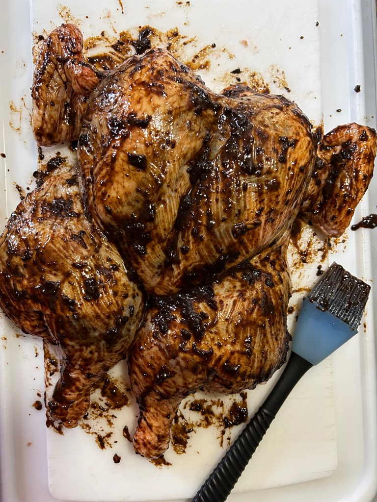 1. Begin by “spatchcocking” the chicken – which is basically a fancy term for ‘flattenning’ the chicken by removing the backbone so it lays flat. There are many videos out there on how to do this – including this one on youtube: https://www.youtube.com/watch?v=Ppa1bxB89vg
