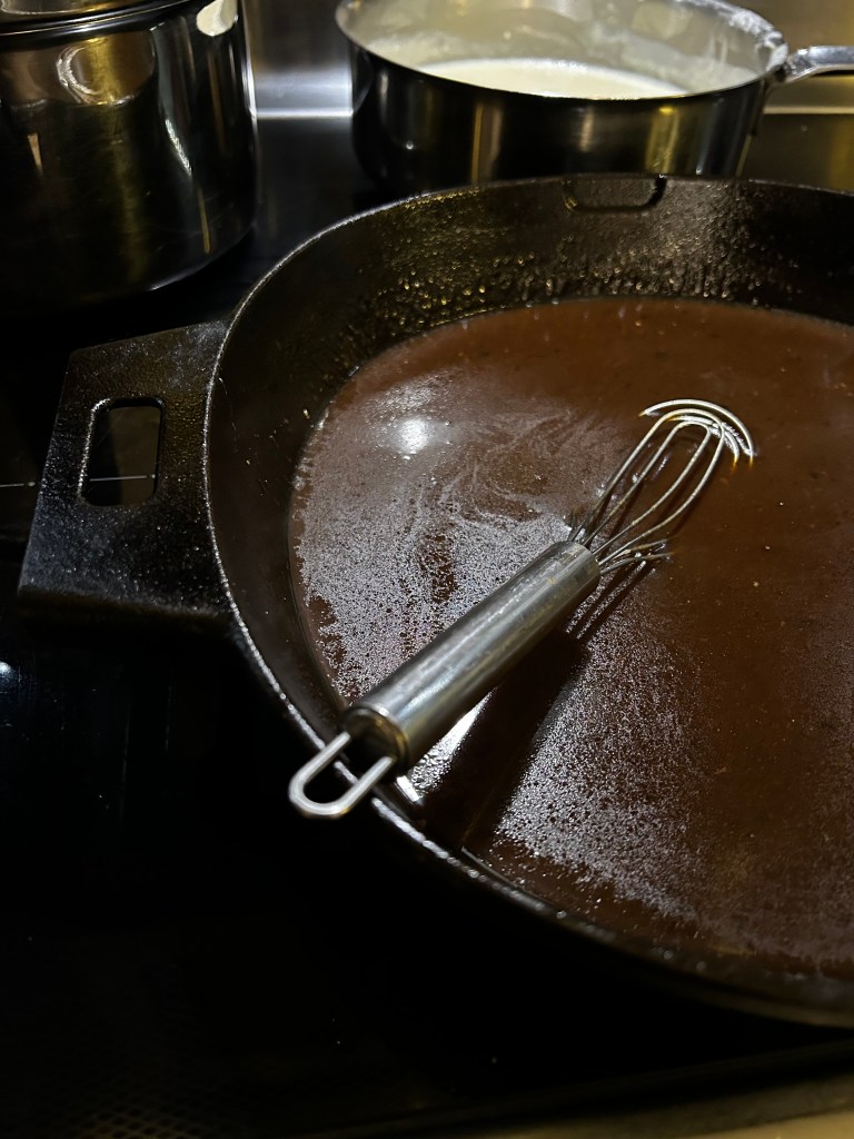 1. In the cast iron pan which was used to cook the chicken (careful it’s not too hot to handle) – heat the retained fat in the pan over medium heat. Add 3 tablespoons of flour and cook, stirring constantly, until it turns golden brown and gives off a nutty aroma, about 2-3 minutes.